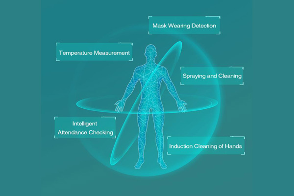وقتی اندازه گیری دما در ناحیه تشخیص هوشمند انجام شد، تمیز کننده القایی می تواند برای تمیز کردن دستها بطور همزمان استفاده شود. اسپری کننده سه بعدی می تواند بطور اتوماتیک بر روی کاربران پس از ورود به ناحیه اتمیزاسیون 360° اسپری کند. ضد عفونی می تواند بر حسب نیاز برای تمیز کردن بدن افراد در کلیه جهات اضافه شود. ناحیه اتمیزاسیون دارای پرده هوا است تا از نشتی اسپری جلوگیری نماید.