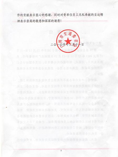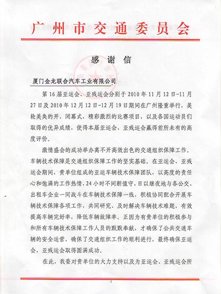 نامه تشکر از کمیسیون حمل و نقل شهری گوانگجو